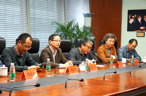 (左一:本屆雙年展中國館策展人邱志杰、左二:文化部外聯局局長助理鄭浩、右二:中國美術家協會《美術》雜志社社長兼主編尚輝)