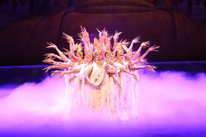 舞臺上,舞者華美的服裝,張力十足的舞蹈動作,以及恢弘的舞臺背景,將瑰麗多彩的敦煌壁畫搬上舞臺,再現(xiàn)了敦煌文化的博大精深和古絲綢之路的繁榮昌盛。通過對創(chuàng)造輝煌燦爛敦煌文化的勞動人民形象的深度刻畫,弘揚(yáng)了絲綢之路“友好通商、互惠共融”的優(yōu)良傳統(tǒng),歌頌了中外人民源遠(yuǎn)流長的偉大友誼。