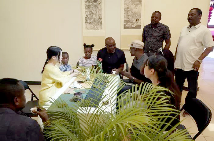 13日下午,茶藝展示活動(dòng)在尼日利亞中國(guó)文化中心拉開帷幕。茶藝師俞元宵首先做了題為“中國(guó)茶室——中國(guó)藝術(shù)的精神空間”的專題講座。俞元宵從中國(guó)茶葉的起源、歷代茶具的演變到陸羽的《茶經(jīng)》,以及茶的對(duì)外傳播交流、品茶之道等,引經(jīng)據(jù)典,以大量精美的圖片再現(xiàn)了中國(guó)茶文化的歷史。講座之后,俞元宵和來自福建武夷山朱衣茶工作室的朱衣老師一起,向來賓們展示了不同茶葉的泡制方法并邀請(qǐng)大家品茗。20幅表現(xiàn)中國(guó)茶文化的繪畫、書法作品也在尼日利亞中國(guó)文化中心同時(shí)展出,不少觀眾駐足觀看。